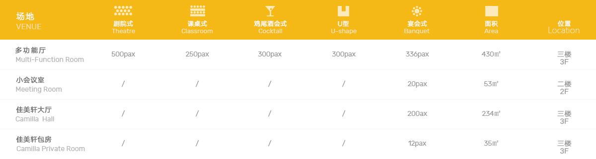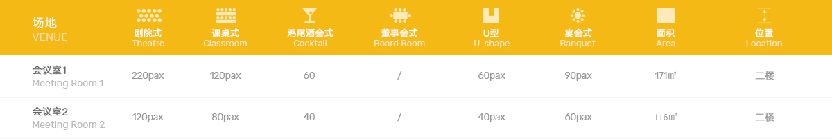 兩間多功能會議室,面積超過300平米,可接待各類型宴會與會議。
